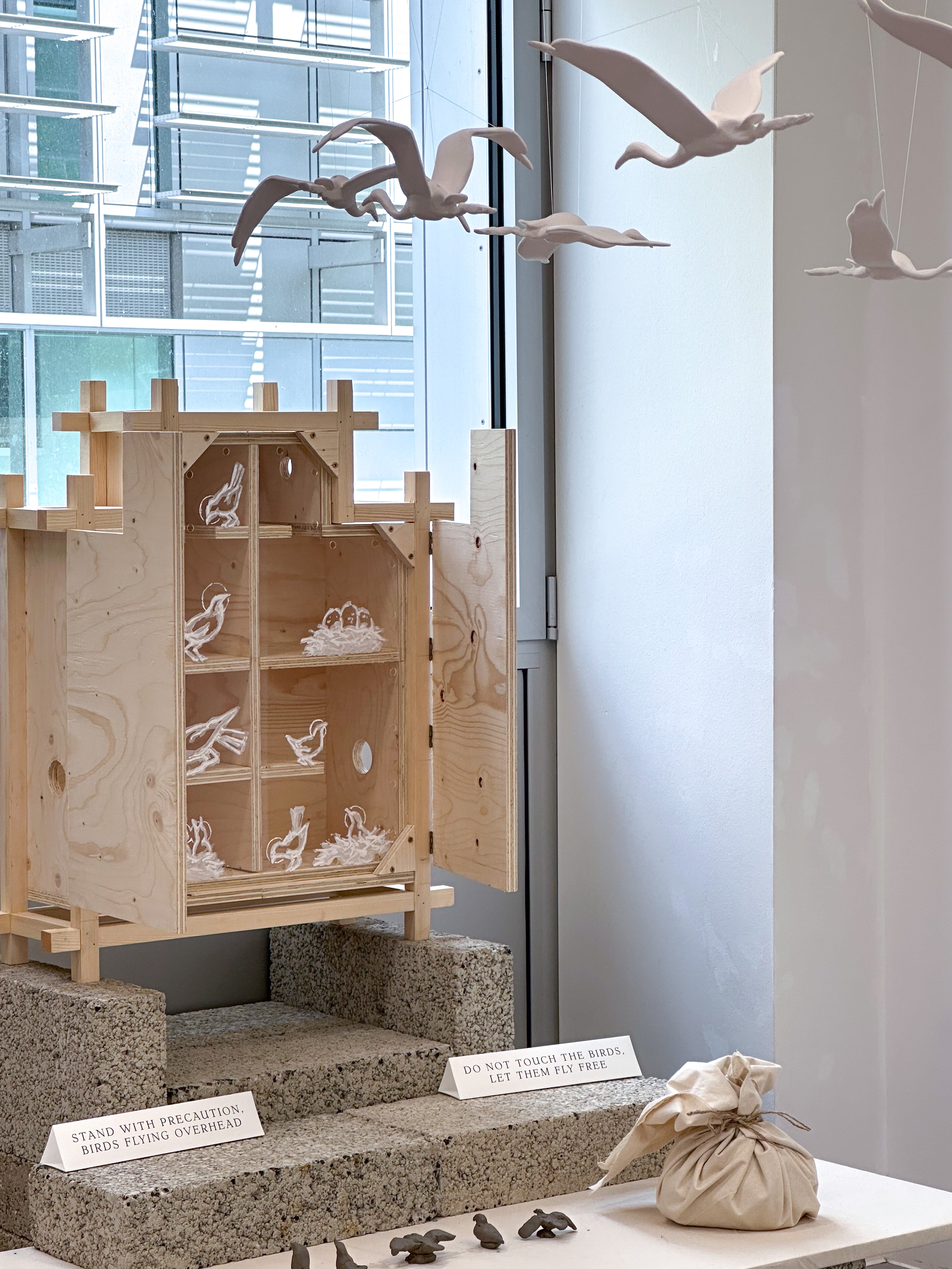 The shrine to Mother Nature comprises a wooden altarpiece that also functions as a birdhouse, a ritual table for making clay figurines as offerings, and a series of porcelain birds in motion.