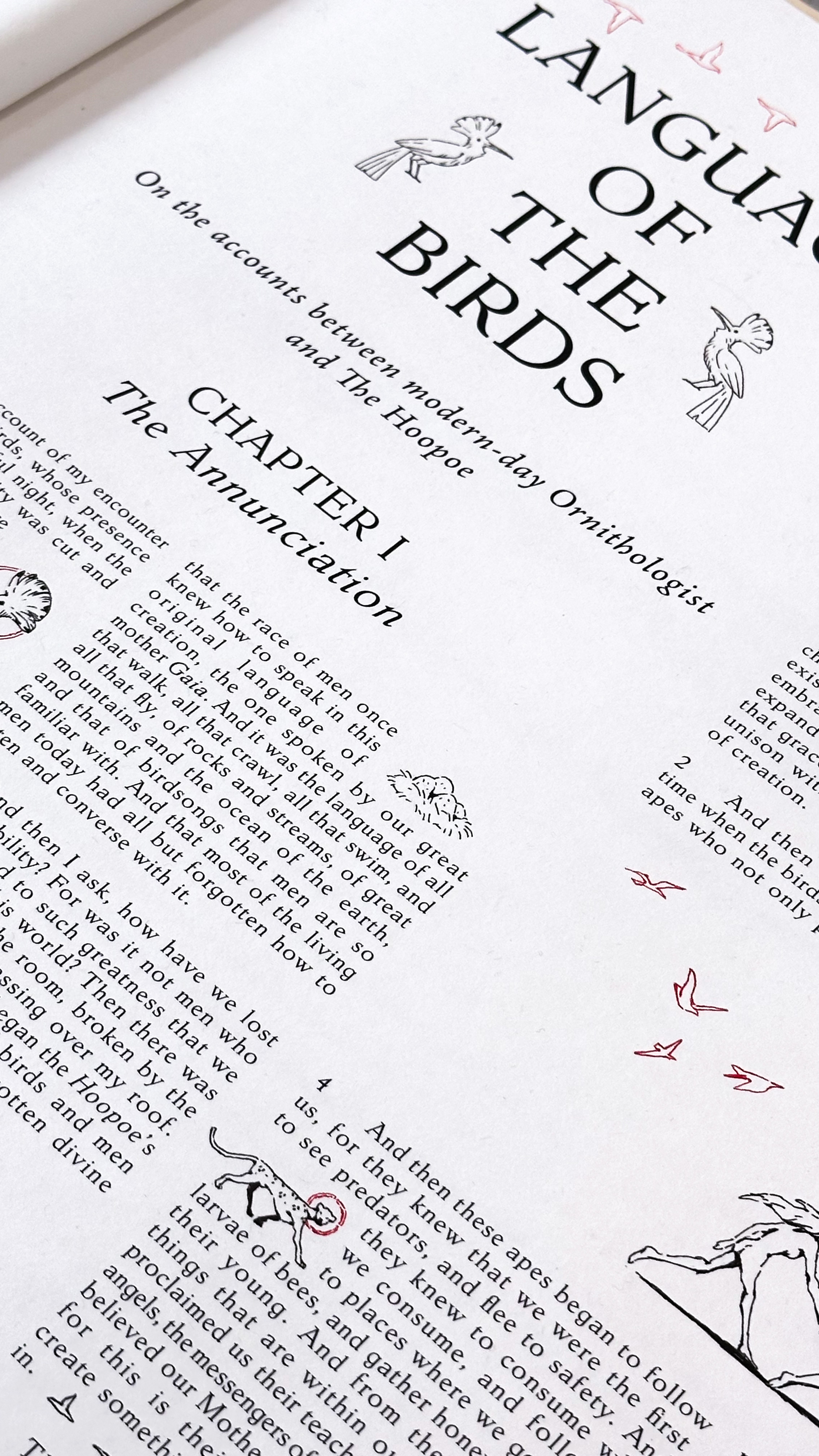A piece of publication narrating the ‘mythology’ of the project. An account of a dialogue between a bird, a Hoopoe, and a modern-day ornithologist on the nature of the human-birds-Mother Earth relationship.