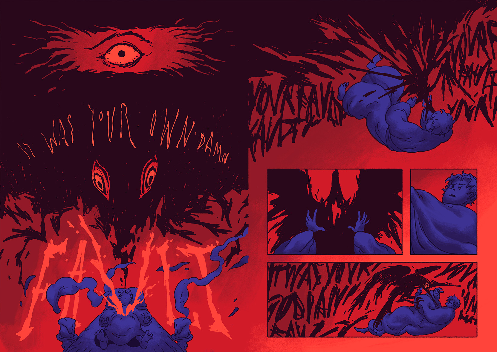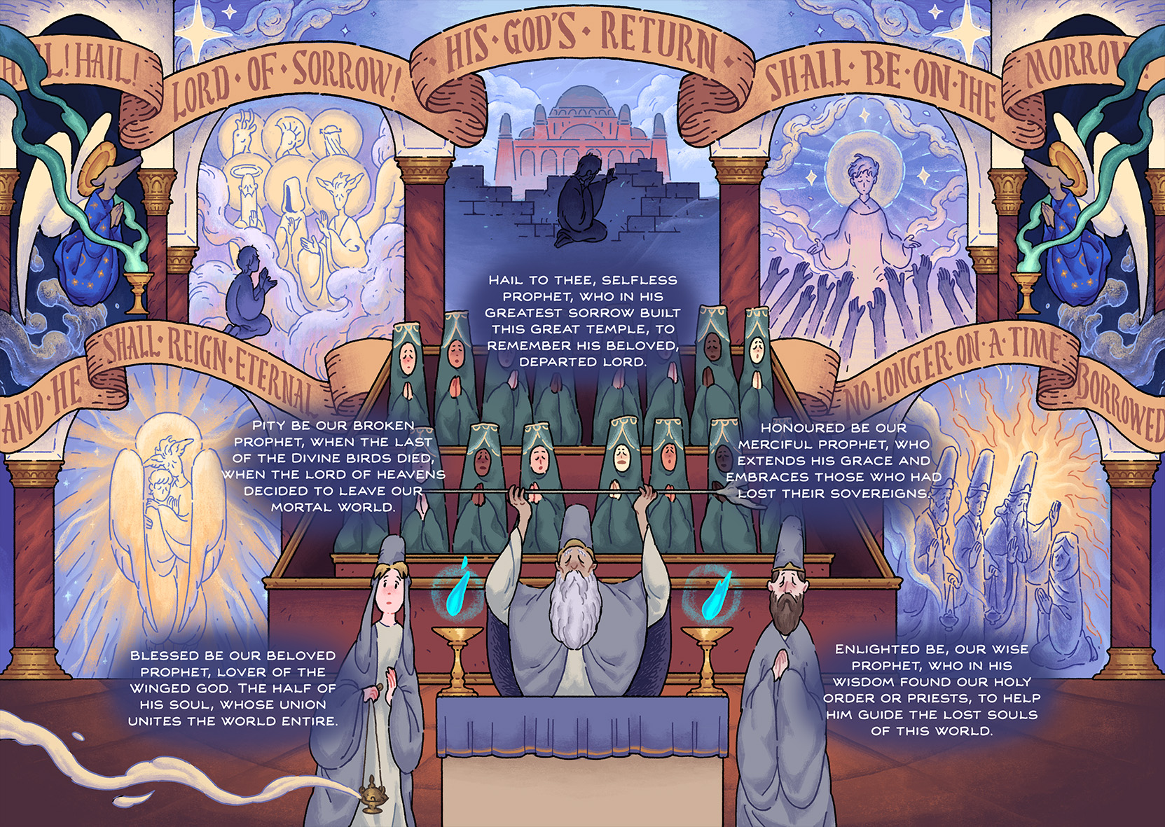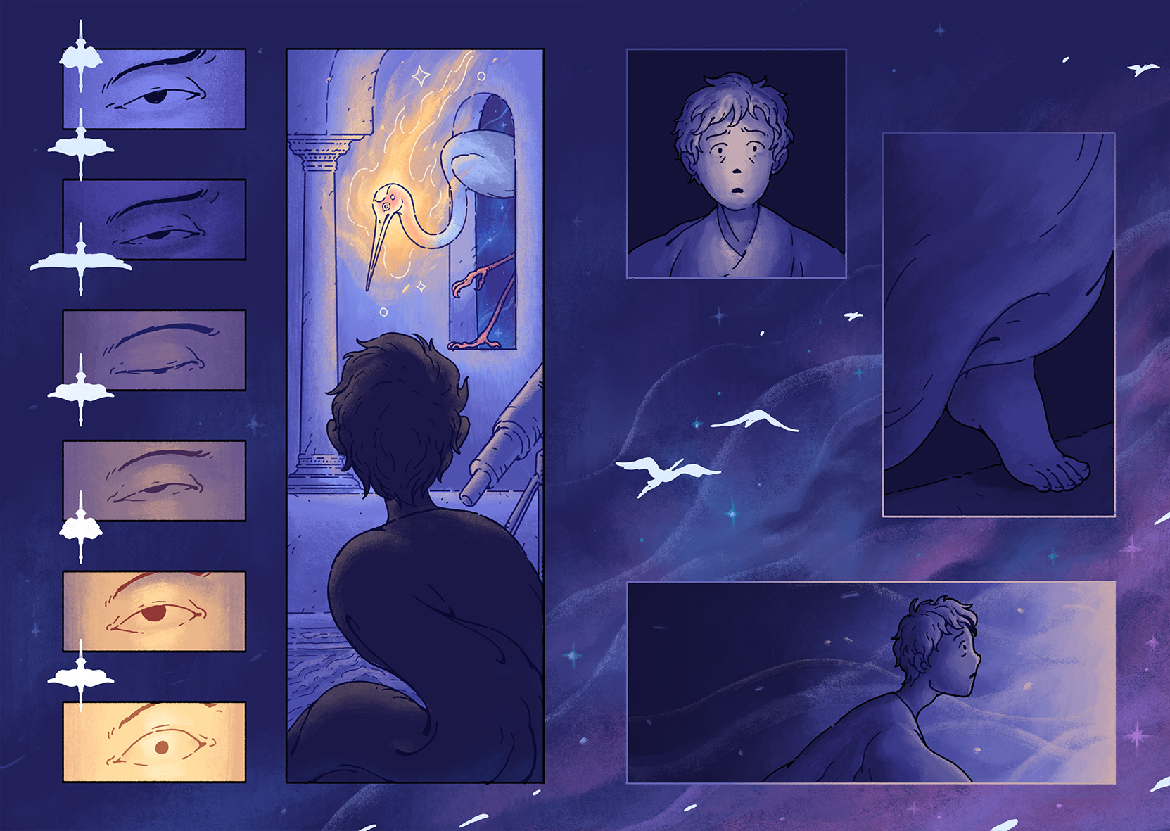 Last Crane is a 128-page graphic novel that tells the story of a prophet tormented by the pain of his god and lover’s departure from the world for 10 years. He was then visited by a vision of a crane - a bird that symbolized their divine union - before setting off across the midnight sky. Following the trail of the blazing comet that followed after the celestial bird, our prophet set out on a journey to be reunited with his divine lover, one last time.